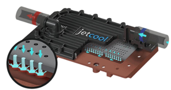 JetCool的直接液冷。液体流入最右侧的端口(蓝色箭头),并被压入喷嘴(中间和插图)。热液体从左侧端口流出(红色箭头)。