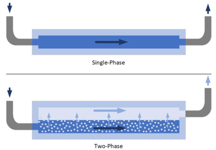 冷板中单相与两相冷却的概念图。在单相冷却中,冷却液保持液态并在CDU(冷却液分配单元)中冷却。在两相冷却中,冷却液沸腾,蒸汽被移除并重新冷凝,从而带走更多热量。